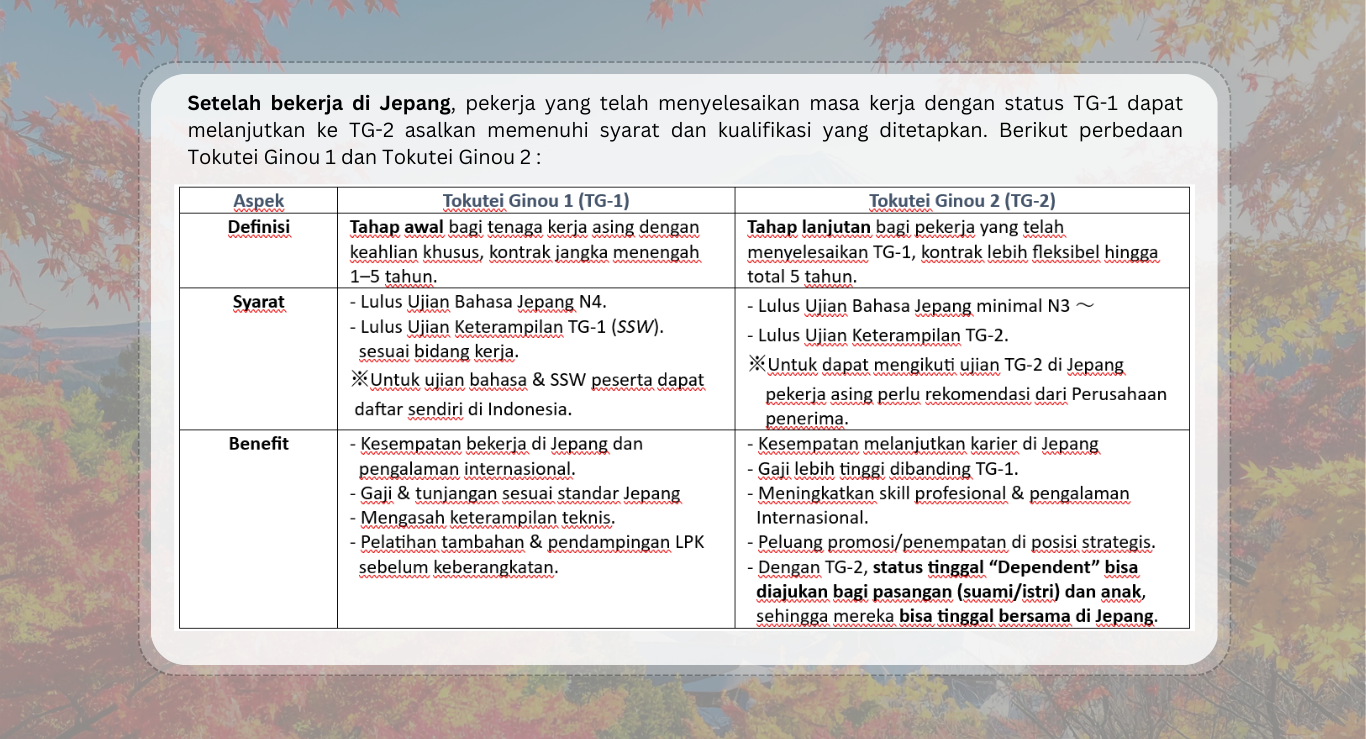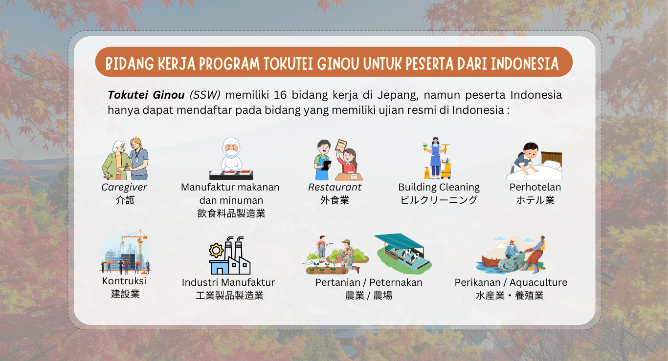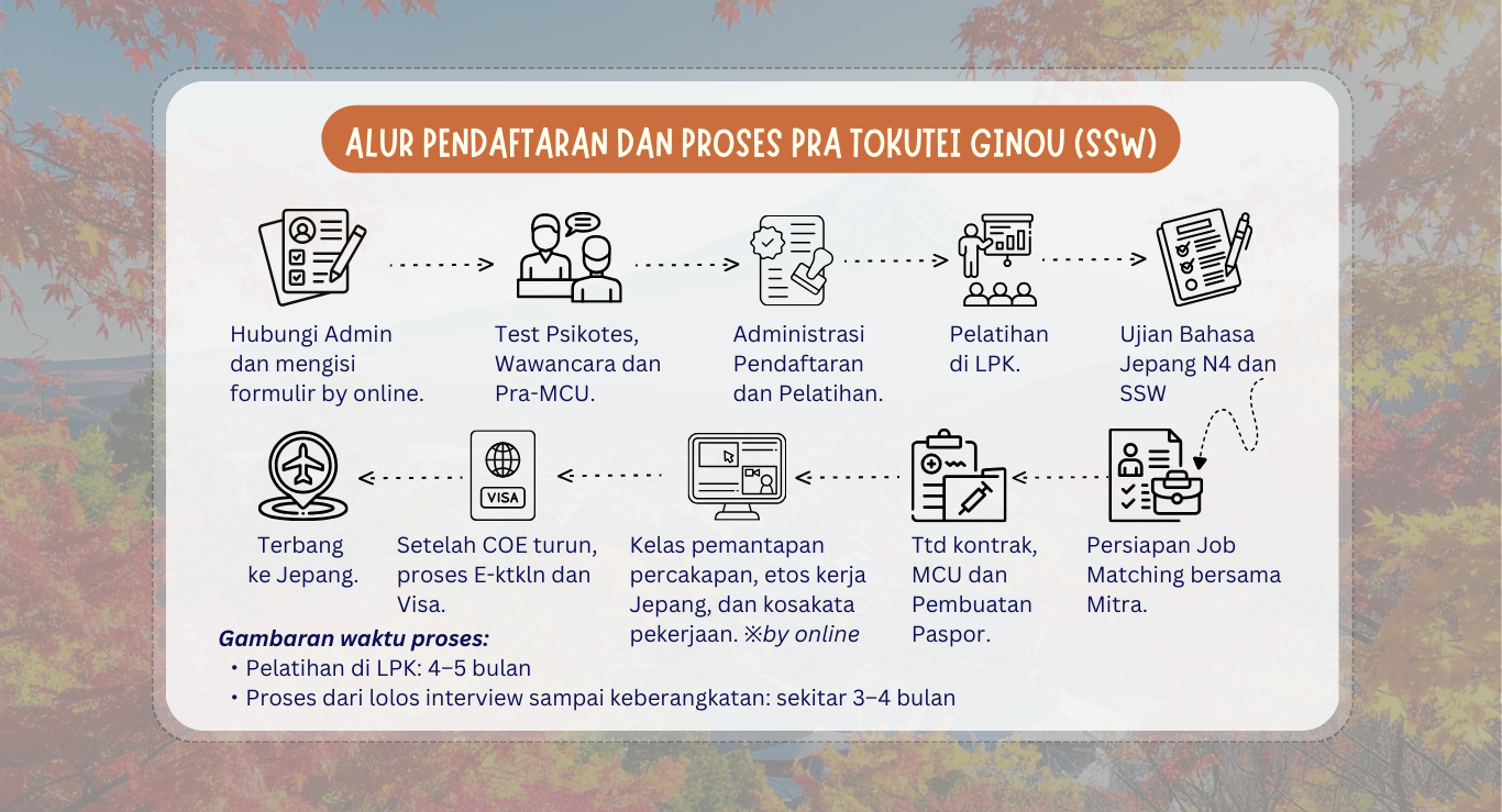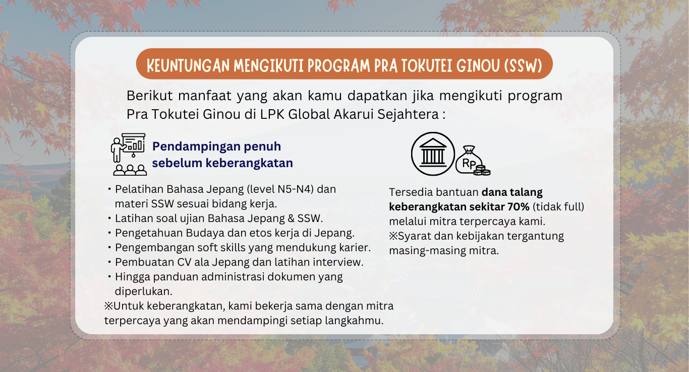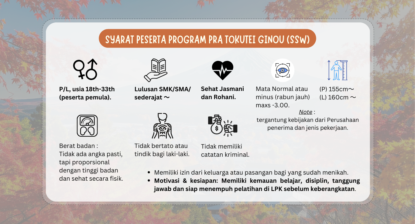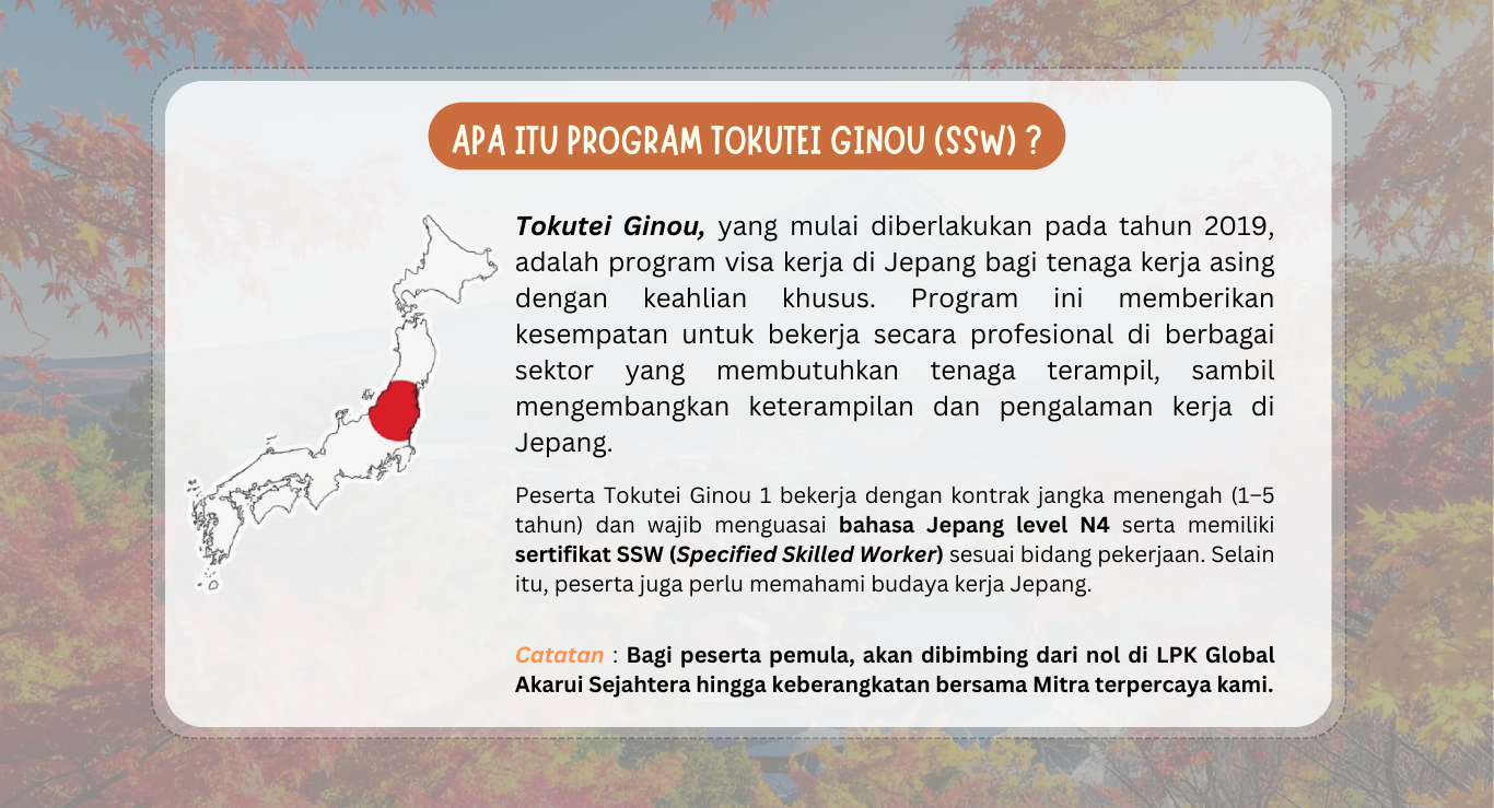 Program Tokutei Ginou (SSW) Klik di sini untuk melihat detail program Engineering Ayo mulai perubahan kecil untuk masa depan yang lebih besar Daftar sekarang, dan mulai perjalananmu menuju Jepang bersama kami. Daftar Sekarang